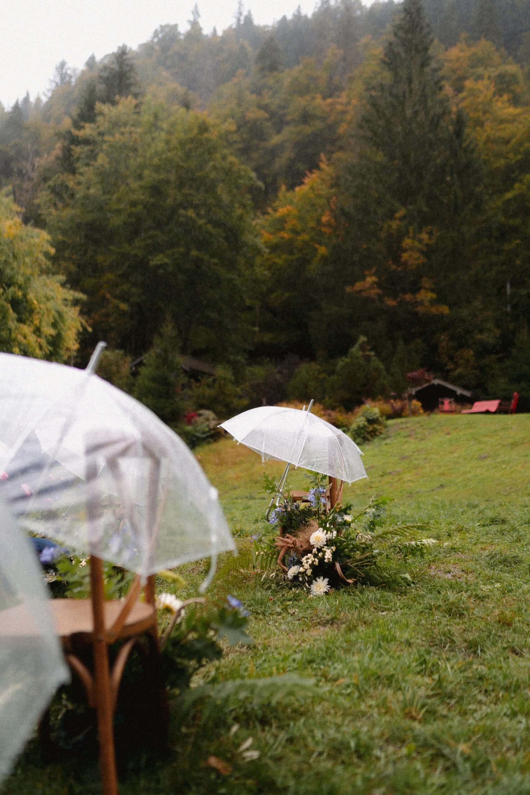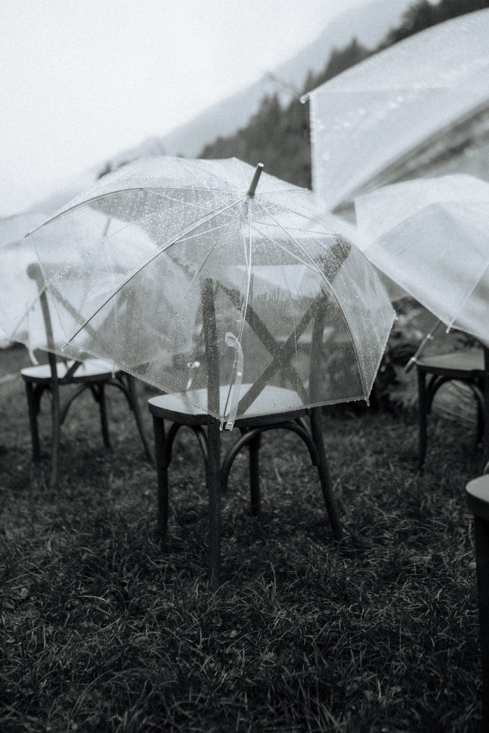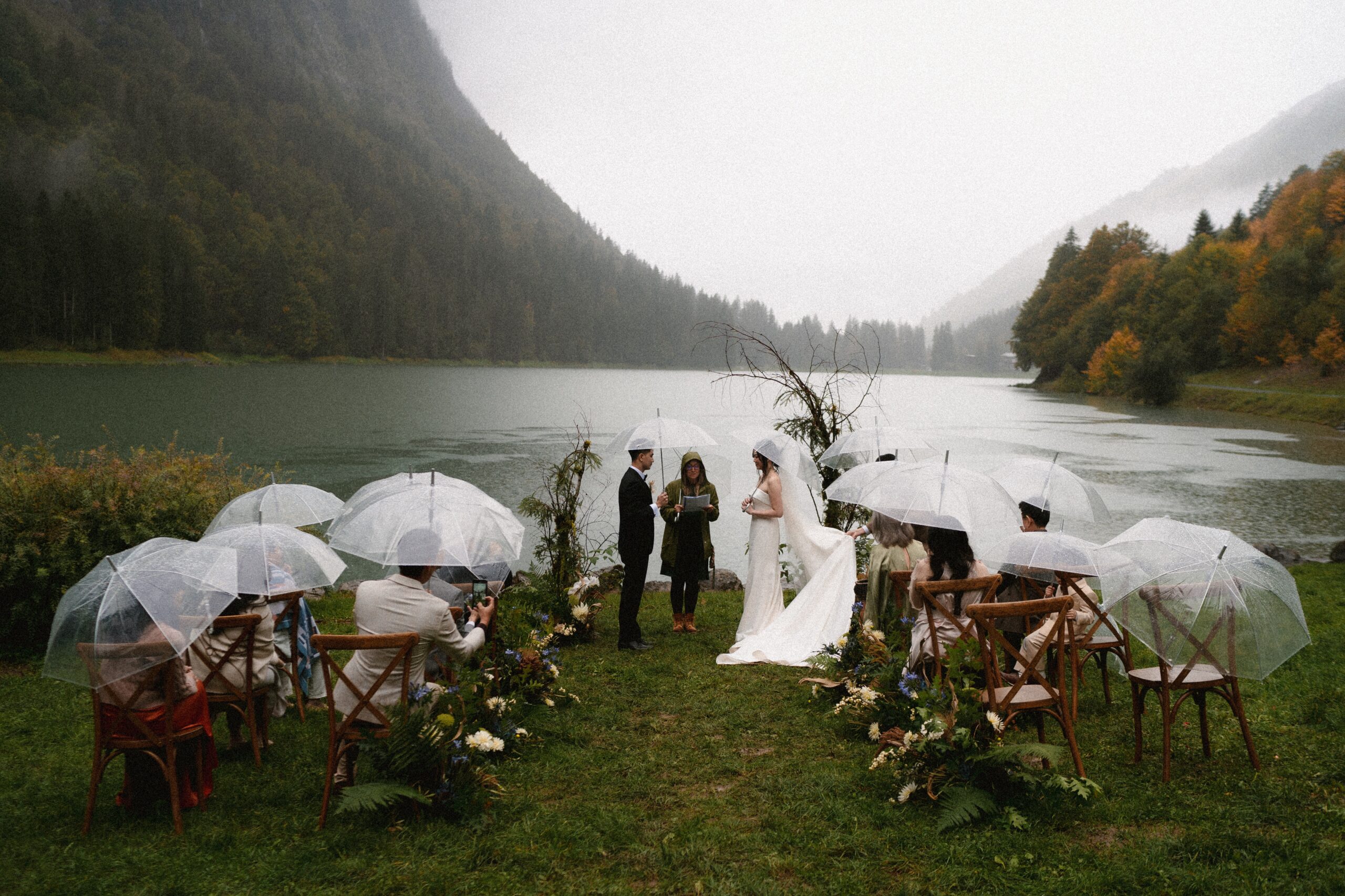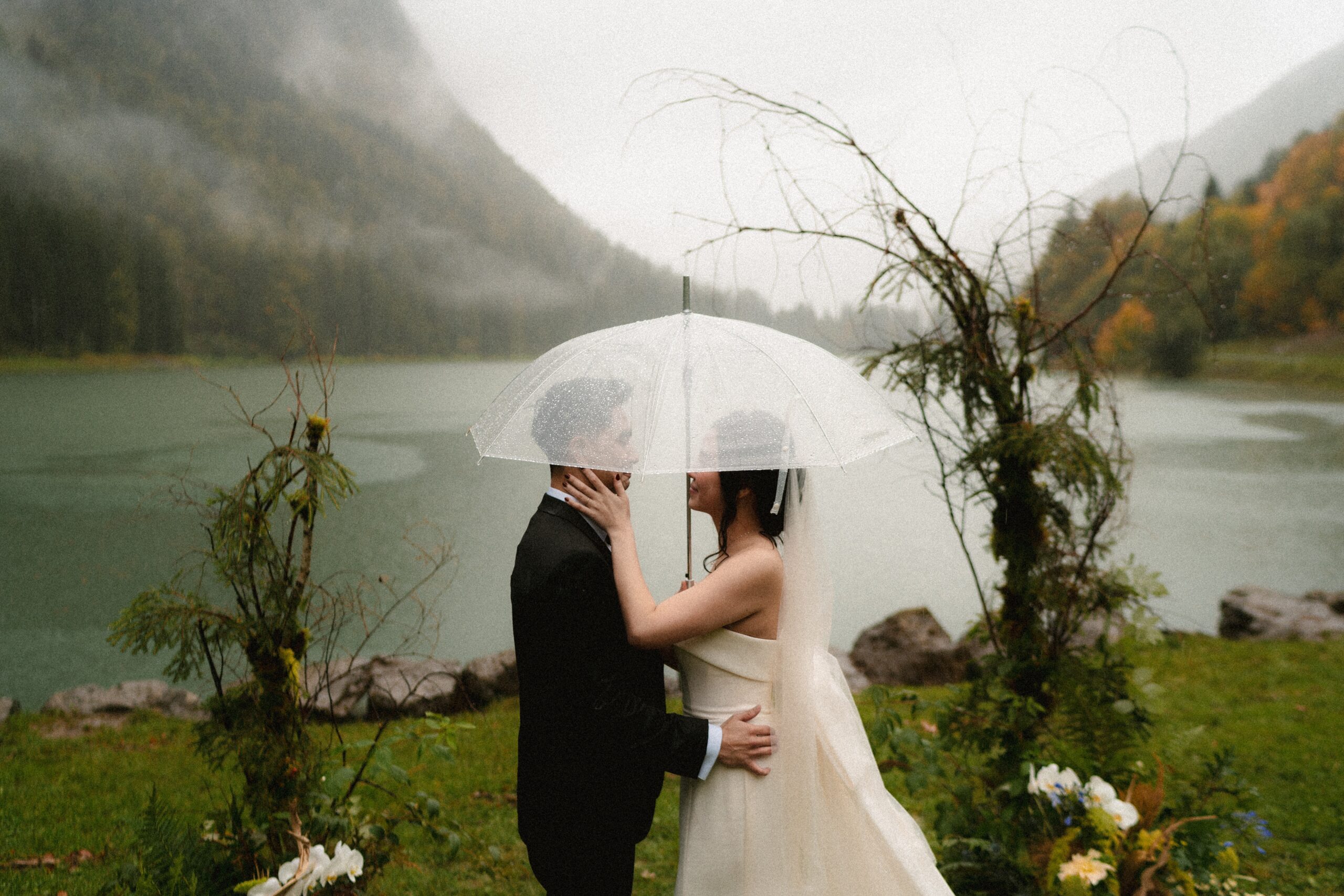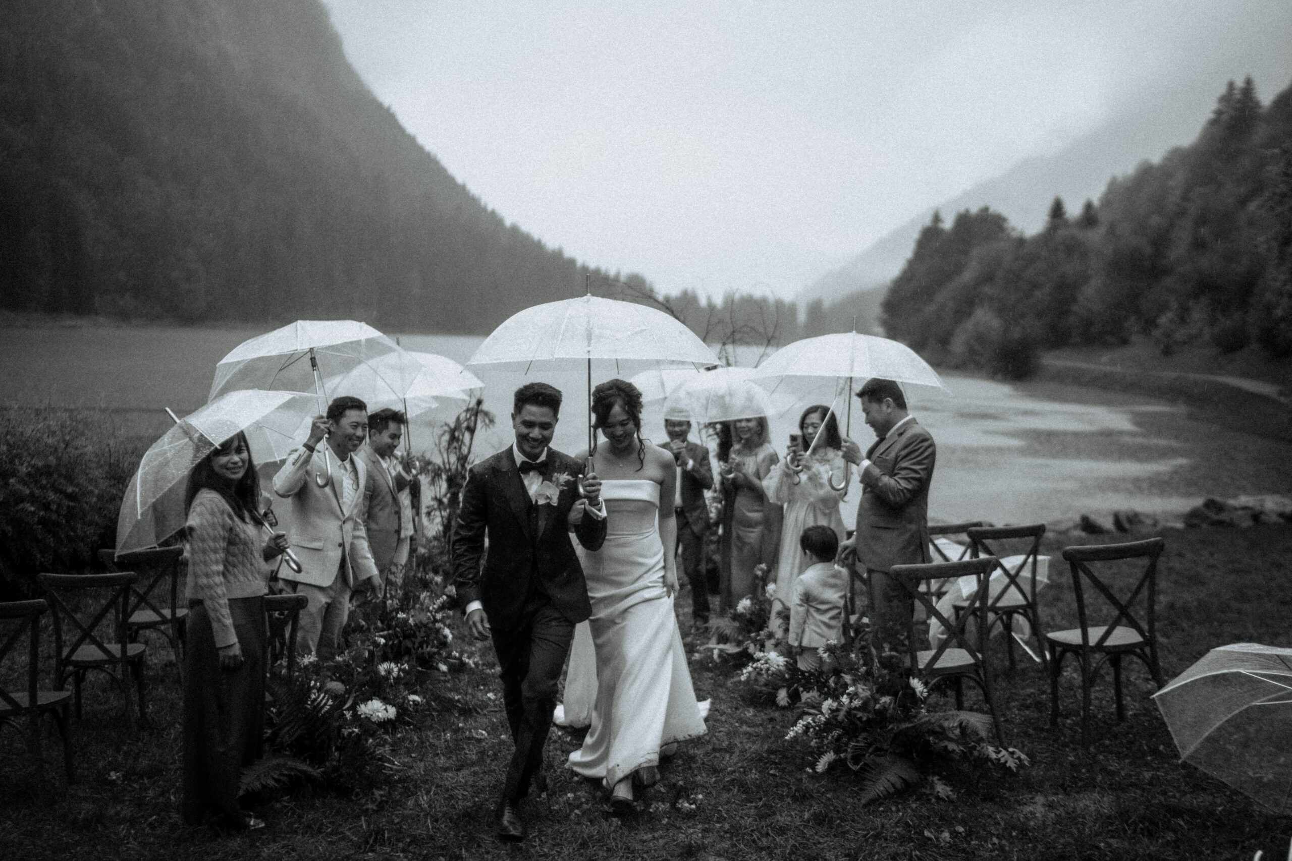 Mariage en extérieur sous parapluies, elopement romantique, couple heureux, photographie lifestyle, photographe créatif.