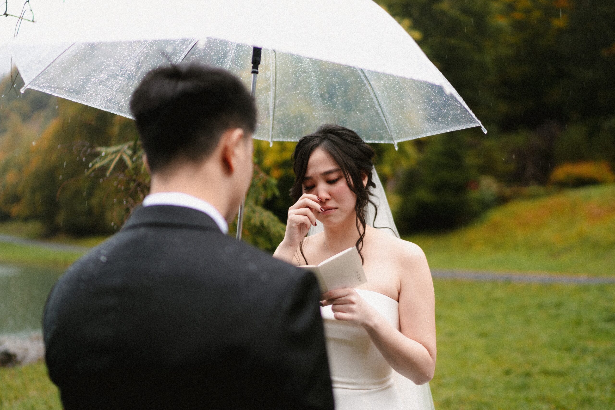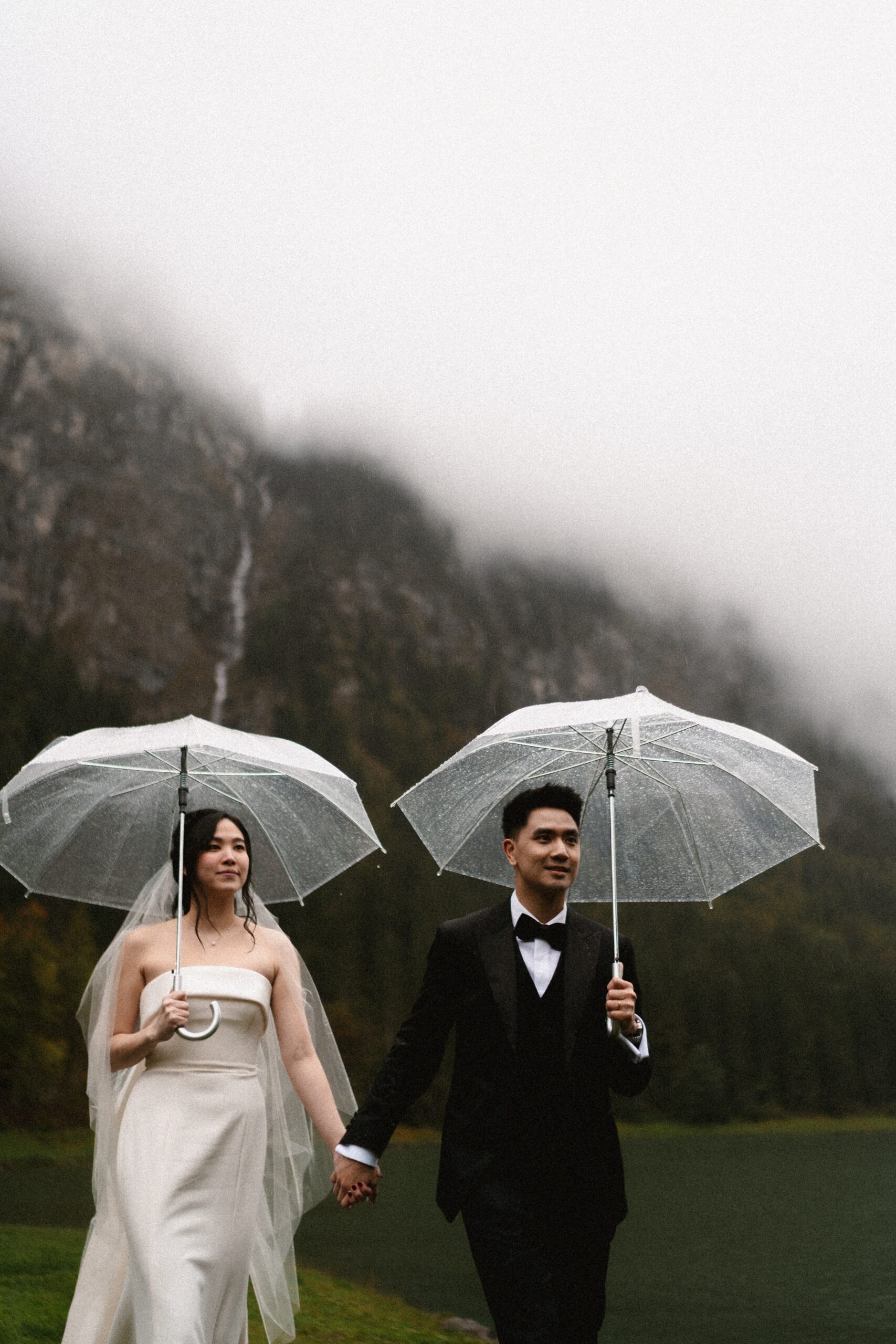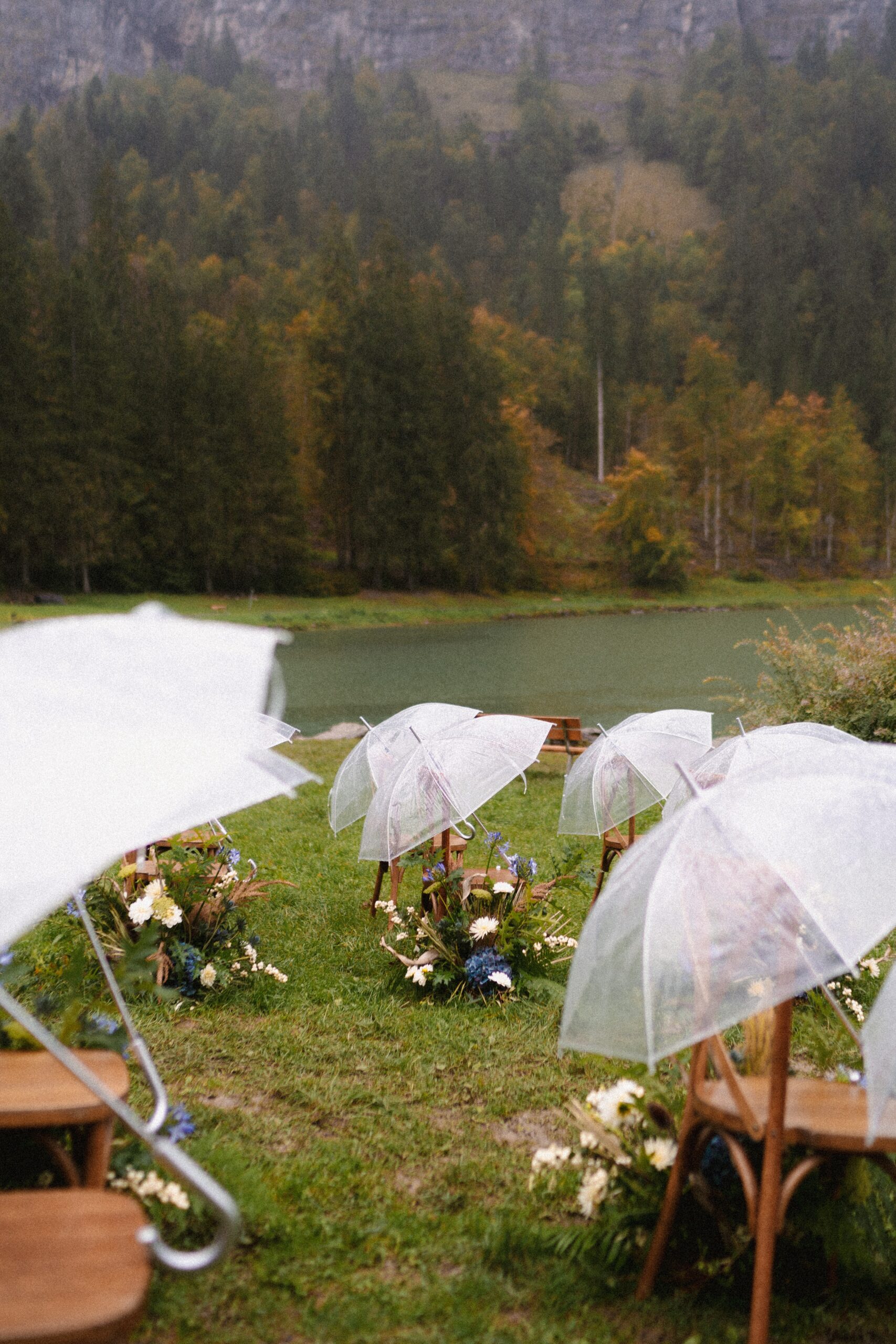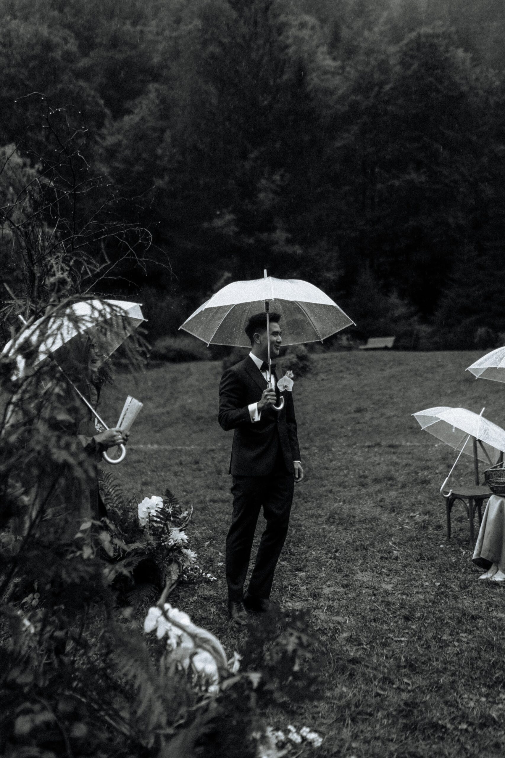Mariage en extérieur sous parapluies, elopement romantique, couple heureux, photographie lifestyle, photographe créatif.