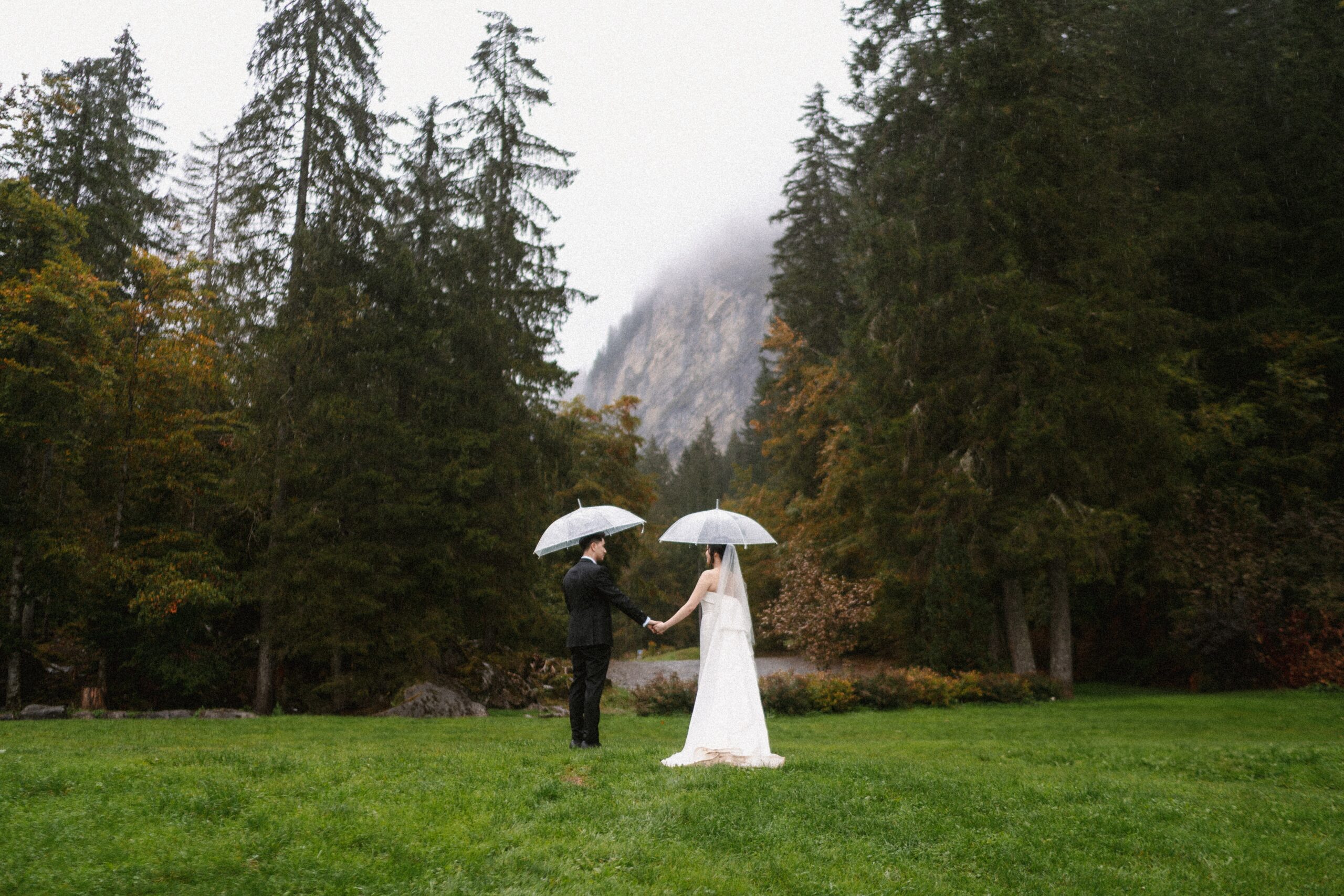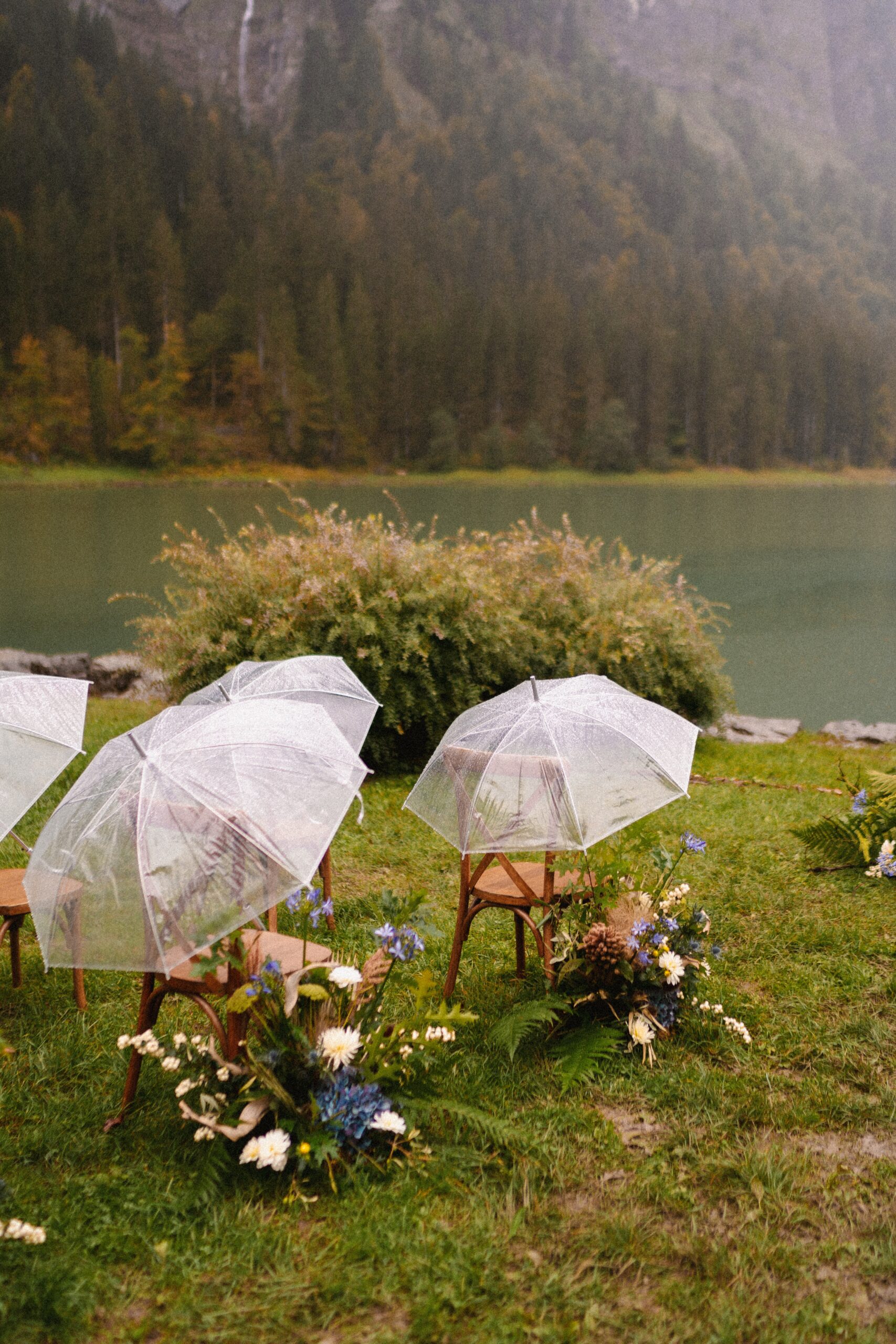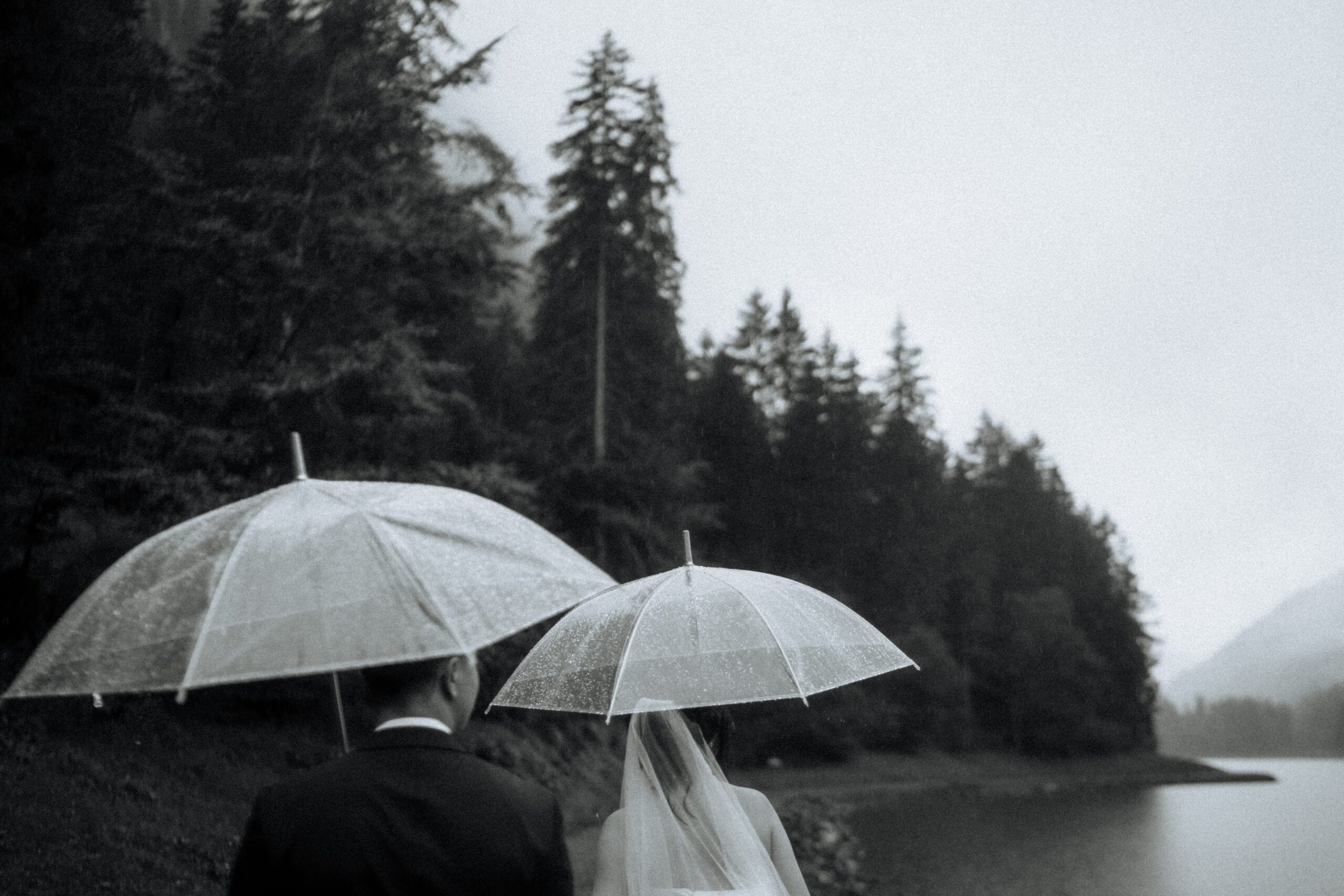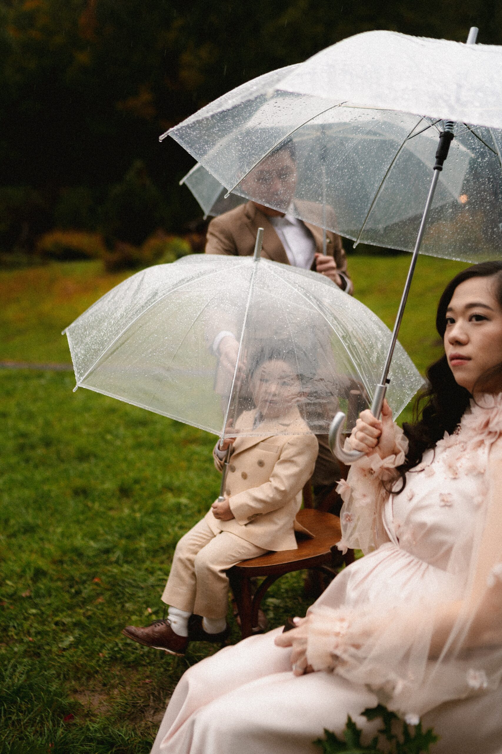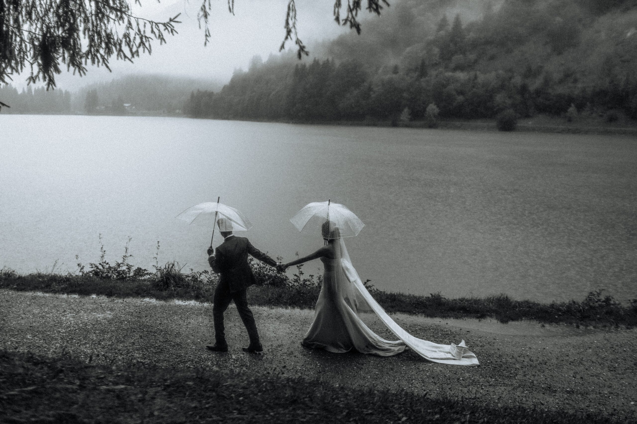 Mariage en extérieur sous parapluies, elopement romantique, couple heureux, photographie lifestyle, photographe créatif.