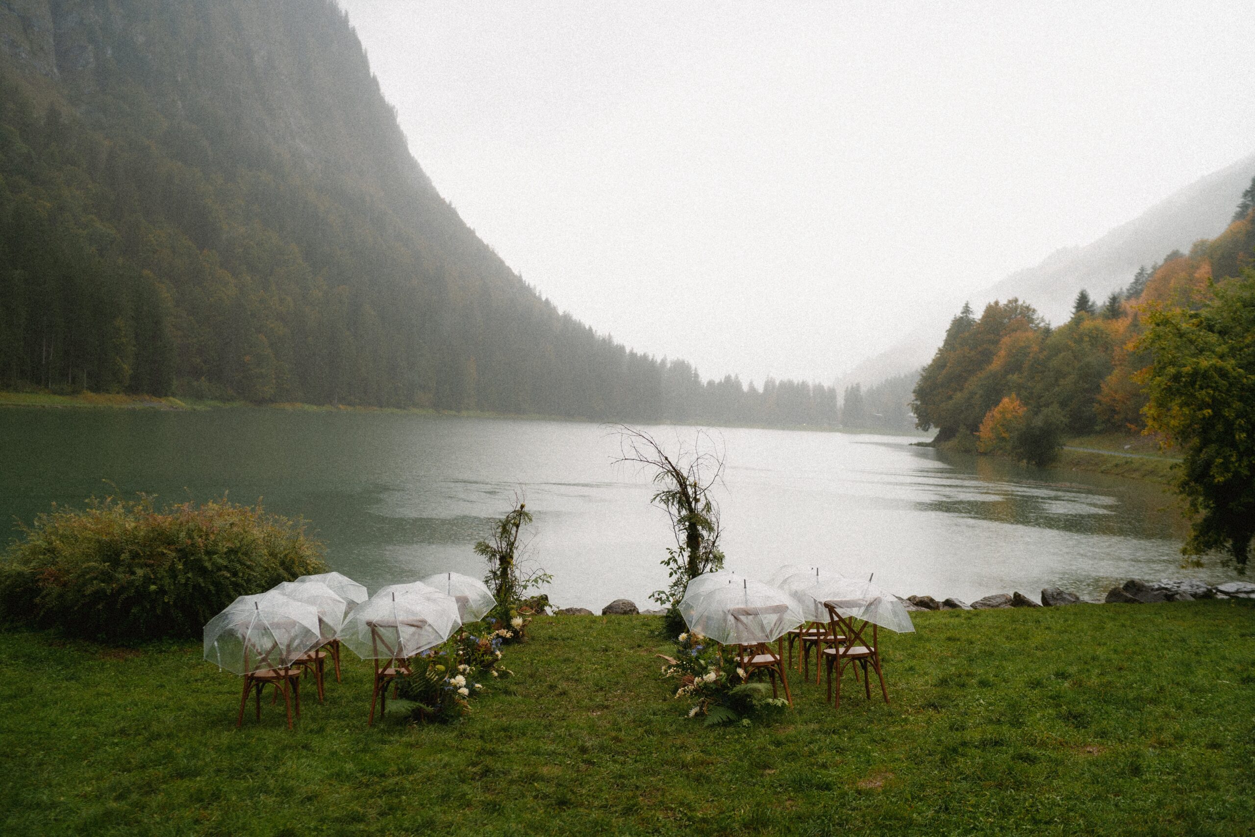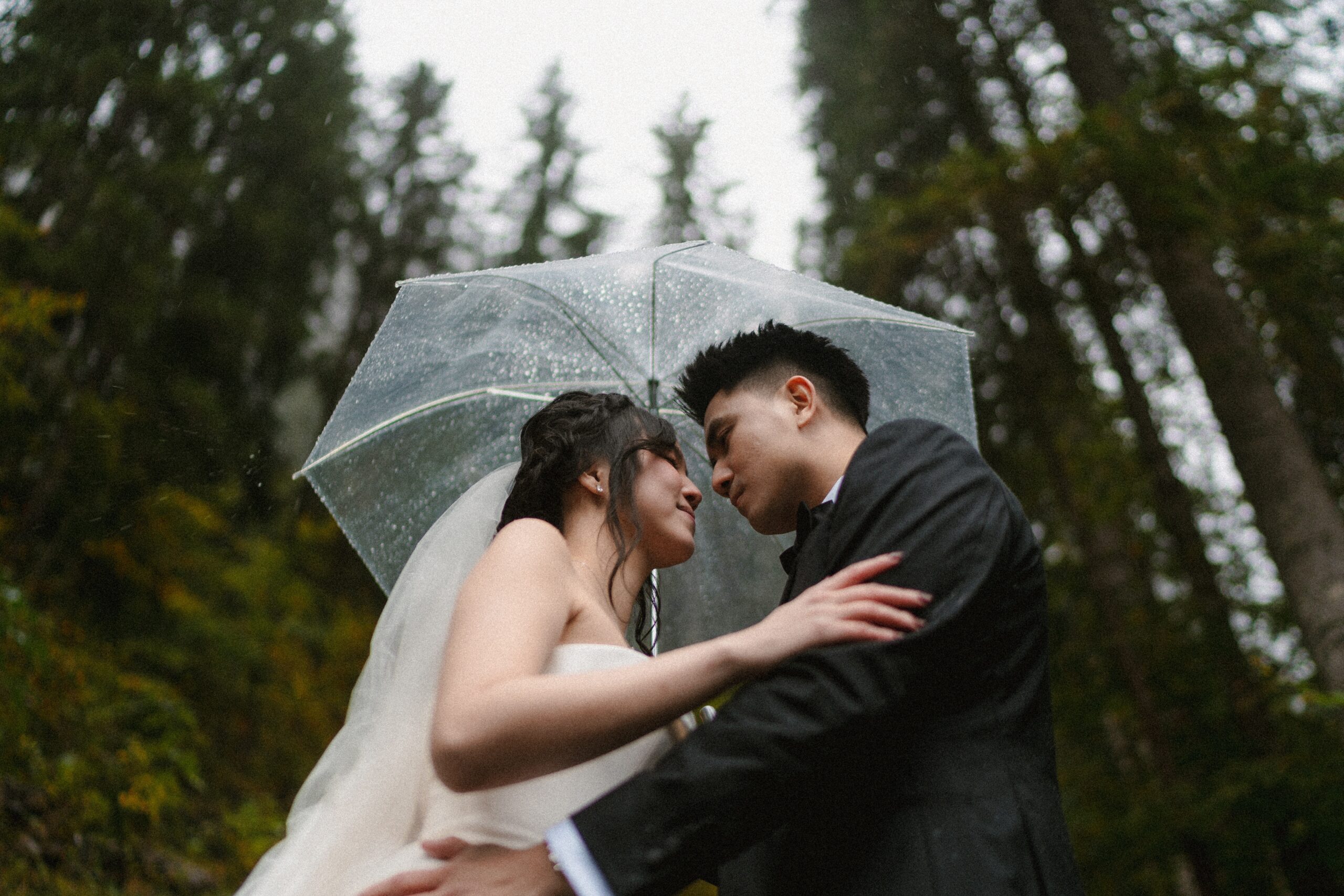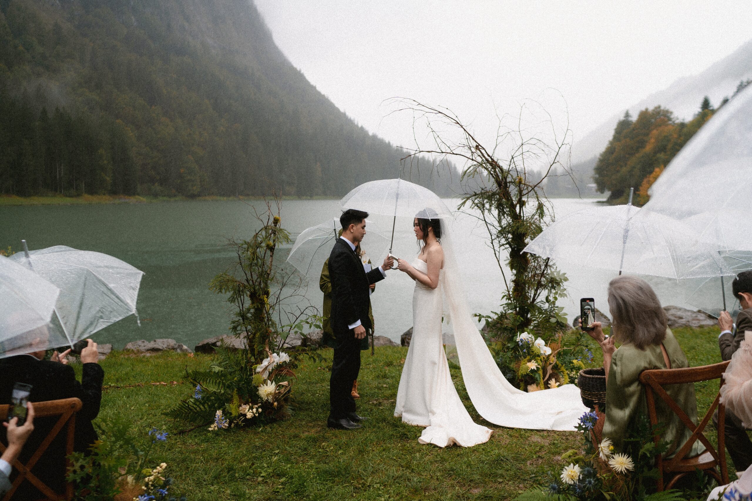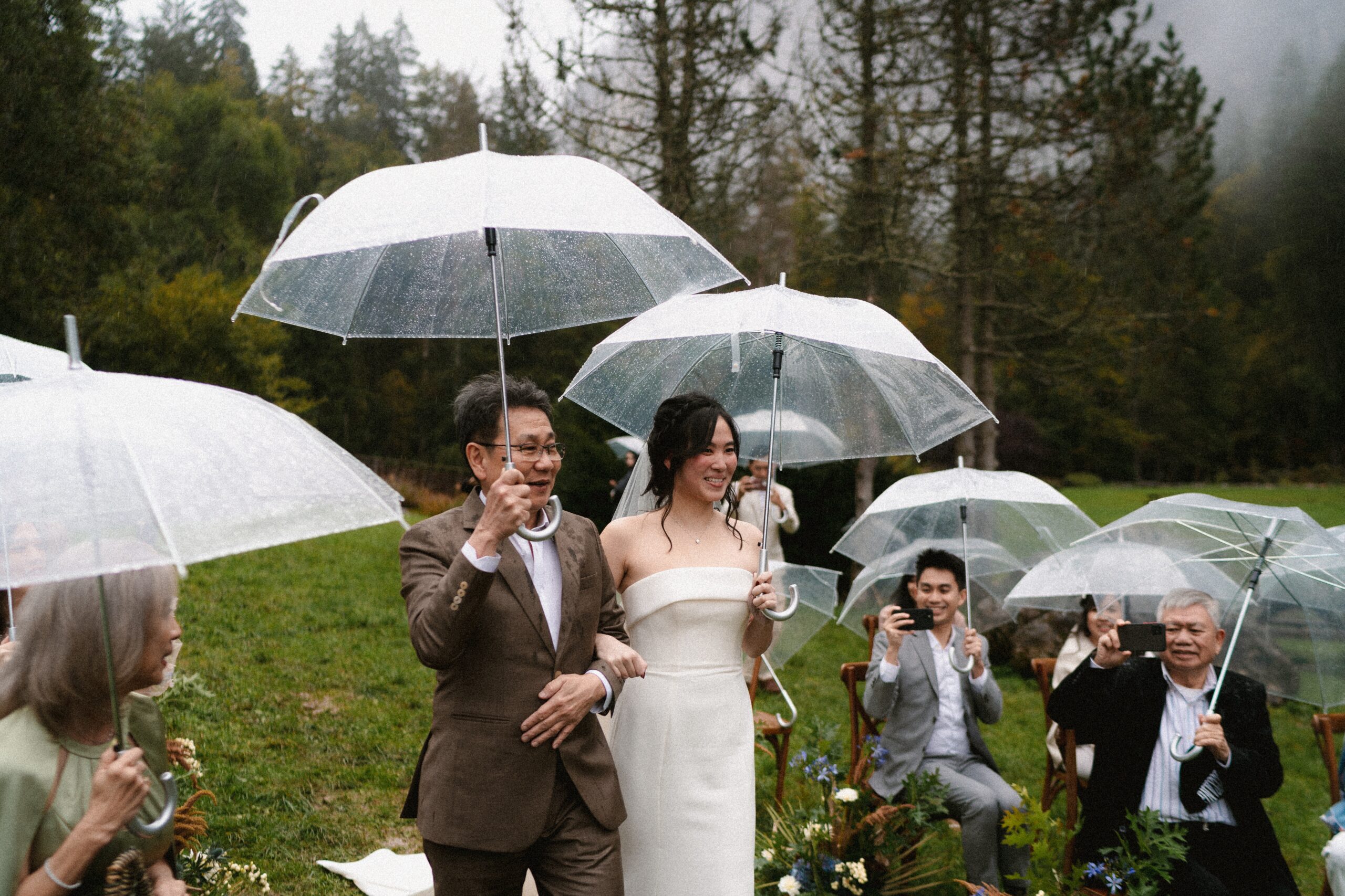 Mariage en extérieur sous parapluies, elopement romantique, couple heureux, photographie lifestyle, photographe créatif.