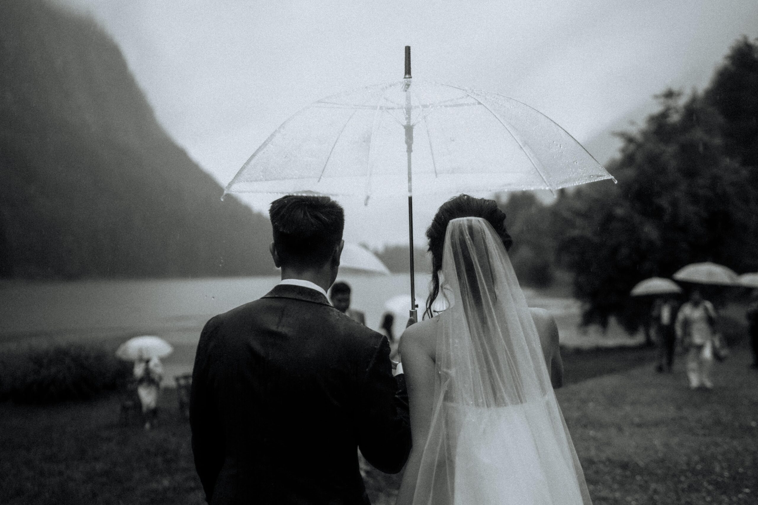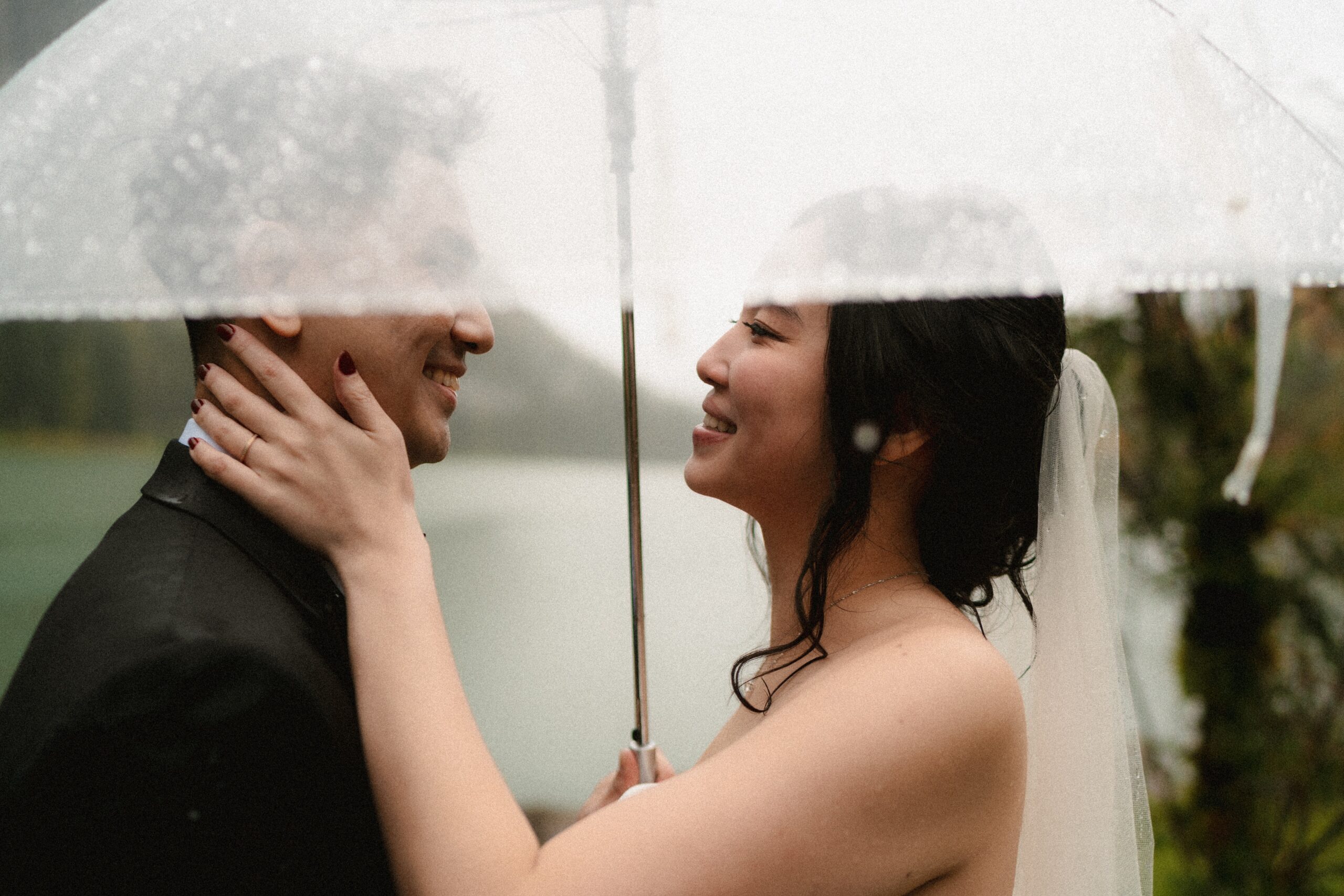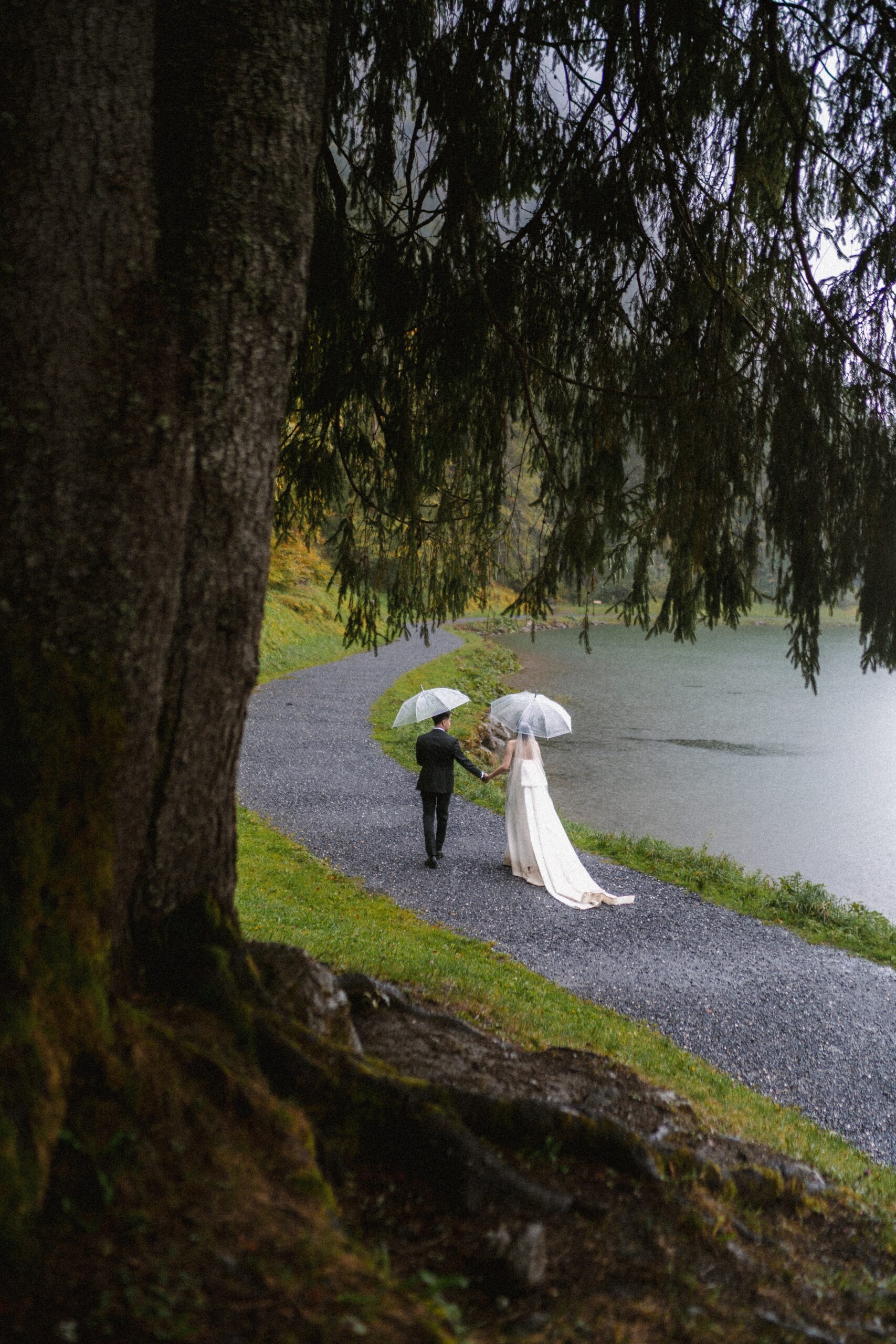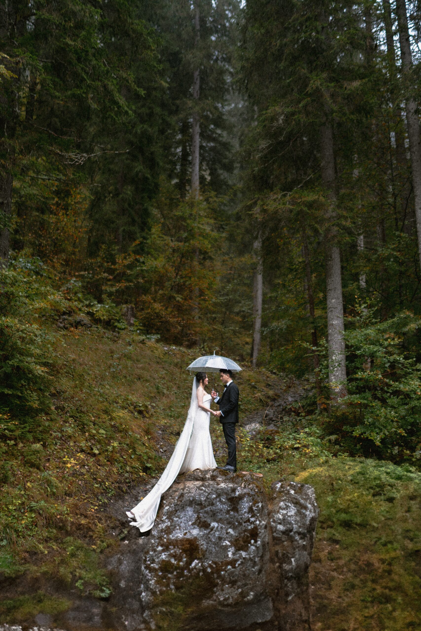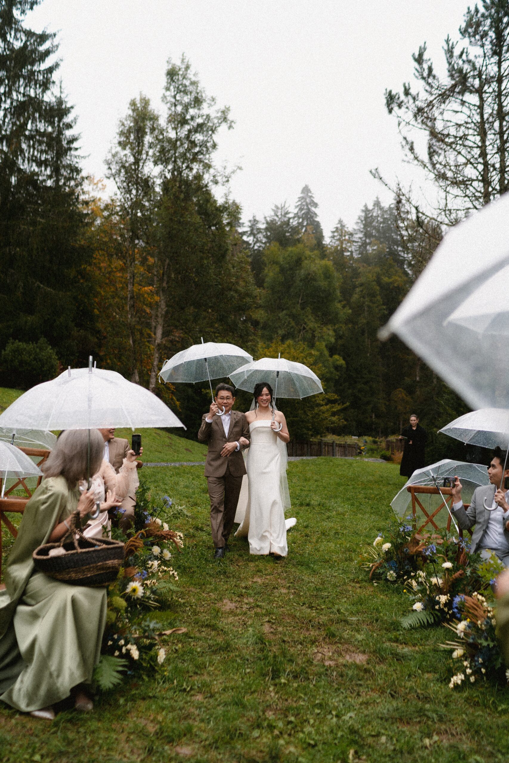 Mariage en extérieur sous parapluies, elopement romantique, couple heureux, photographie lifestyle, photographe créatif.