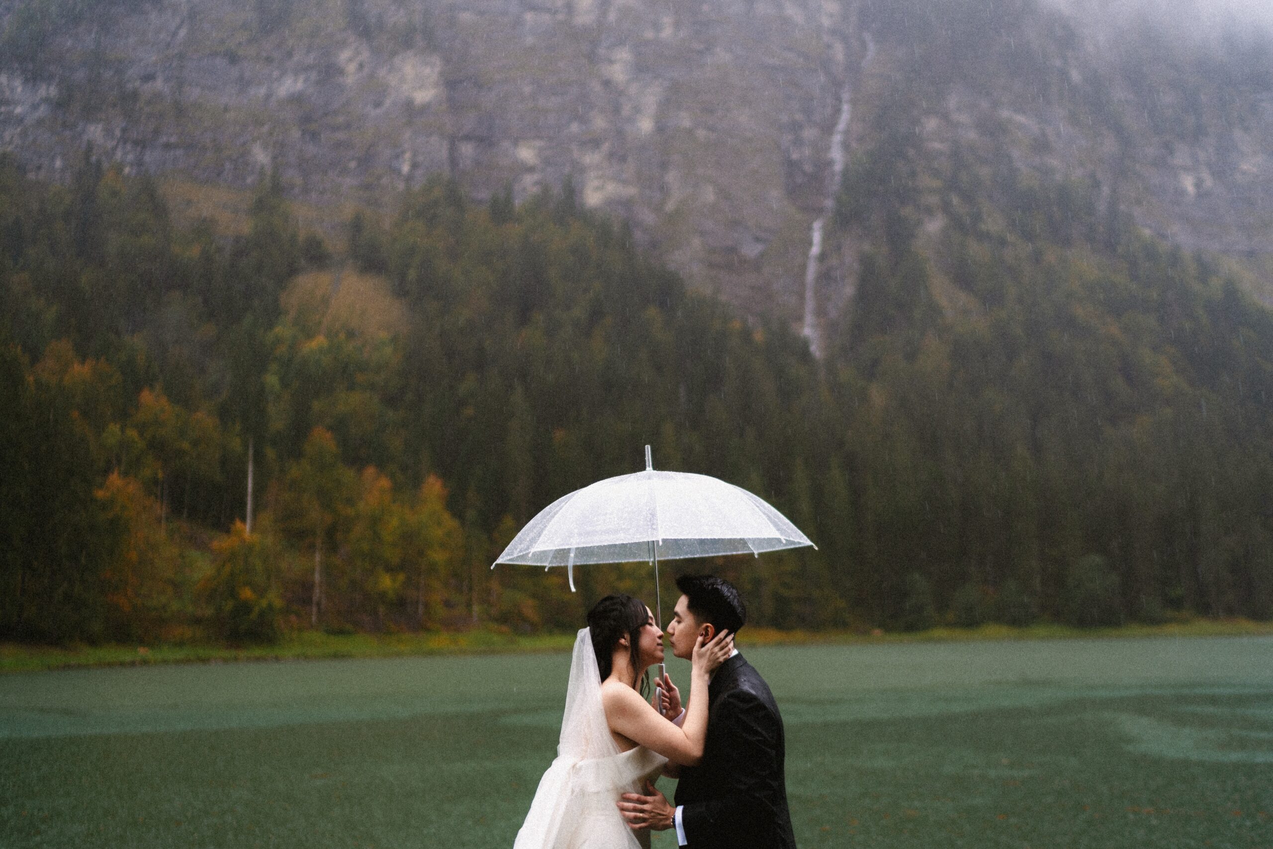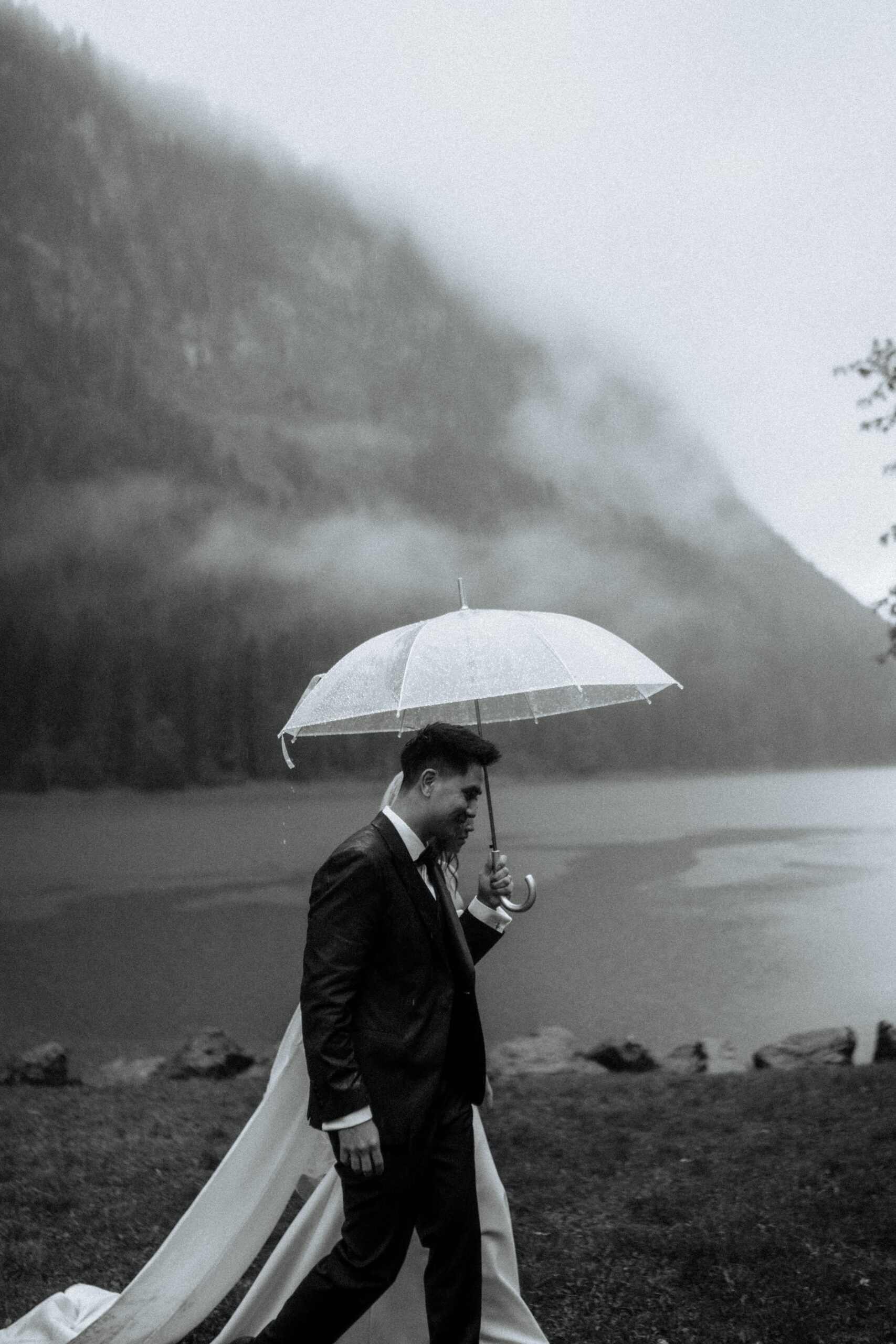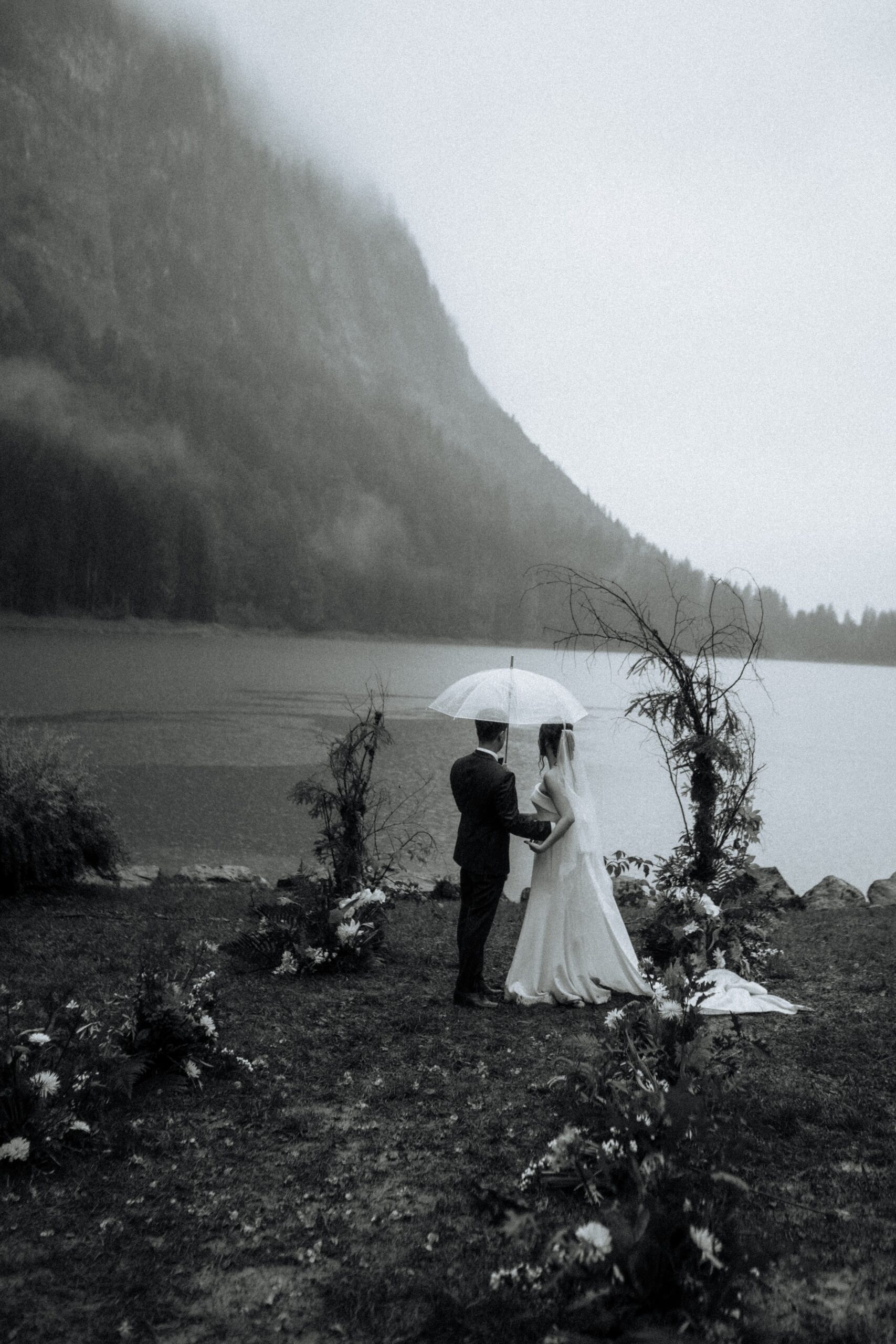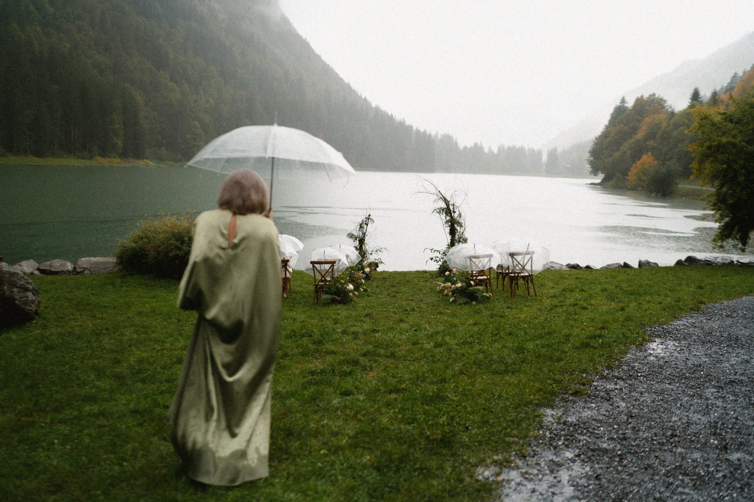 Mariage en extérieur sous parapluies, elopement romantique, couple heureux, photographie lifestyle, photographe créatif.